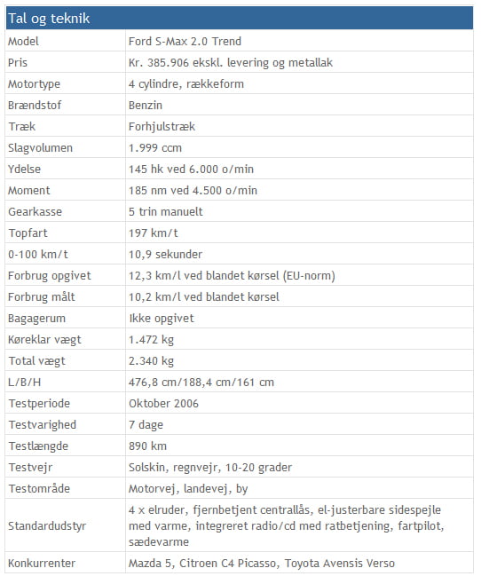 Der findes et hav af modeller som alle søger at gøre det samme som S-max, nemlig at være en rummelig, velkørende familiebil med et højt kvalitetsindtryk. Her er mange gode små rum og praktisk aflæggeplads. Ikke mange gør det lige så godt og ingen vi har testet gør det bedre. Så enkelt kan det siges. Vi er ikke alene om roserne, for omtrent fra alle sider af pressen står man i kø med stjerner til denne fine vogn.