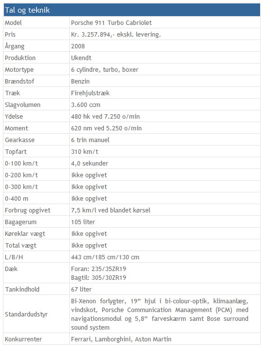 Selvom sommeren ikke har været den bedste, kan man jo godt drømme sig væk i en Porsche 911 Turbo uden tag. Med premiere i september 2007 løftes sløret for den seneste version af 911 Turbo Cabriolet. Hermed fortsættes den tradition, som Porsche startede for 20 år siden med den første topløse 911.