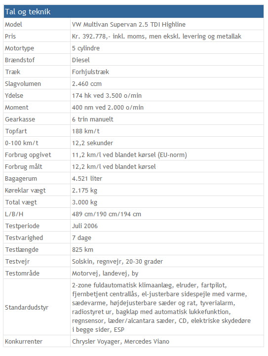 Et folkevognsrugbrød, som bilen i den oprindelige version blev døbt af folket, bør vel have en rugbrødsmotor. Men det er ikke tilfældet i VW multivan, hvor man har satset på en femcylindret turbodiesel med ikke færre end 178 hestekræfter og et moment på 400 nm. Det er meget for bilen, særligt når den ikke er lastet. I regnvejr blinker ESP-knappen lystigt, hvis man trykker en smule på speederen. Motoren giver selvsagt et ordentlig skub bagi, når gaspedalen går mod gulvet. Gearingen er i øvrigt meget høj, hvilket betyder, at bilen kun tøffer med 2000 o/min i sjette gear, når fartpiloten er sat til 110 km/t. Bilen kan i topgearet trække rent fra blot 1000 o/min, hvilket svarer til knap 60 km/t. Det er imponerende.