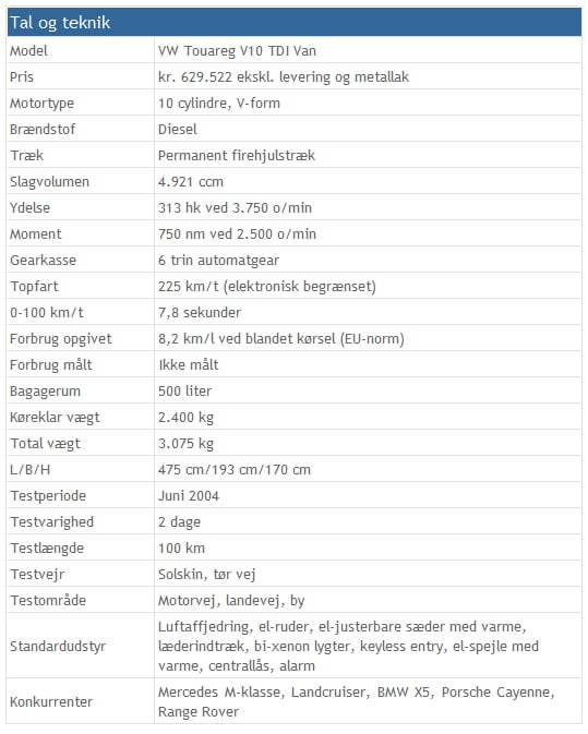 Tag en nyudviklet 10-cylindret diselmotor med 313 HK og et ufatteligt moment på 750 NM og prop det i en forvokset folkevogn med firehjulstræk. Tilsæt lidt læder og et 6-trins automatgear og kom så gule plader på uhyret. Du betaler herefter en bagatel af kr. 630.000 og vupti så du har en Touareg van, en knap 2.5 ton tung ”varevogn”, som lovligt kun huser dig selv og en enkelt passager.